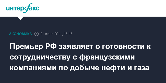 Париж. 21 июня. INTERFAX.RU - Французские компании проявляют интерес к участию в добыче нефти и газа в России, заявил премьер-министр РФ Владимир Путин в ходе встречи с активом Ассоциации "Франко-российский диалог".
