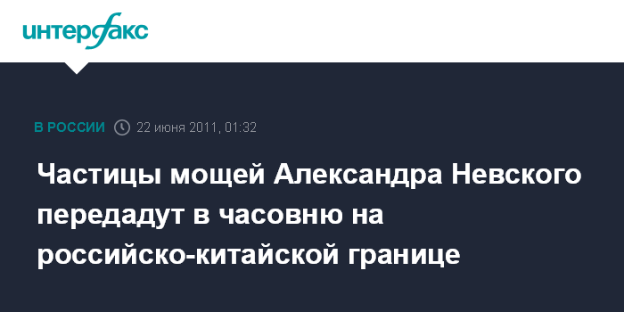 Хабаровск. 22 июня. ИНТЕРФАКС-ДАЛЬНИЙ ВОСТОК - В День памяти и скорби ковчег с мощами святого благоверного великого князя Александра Невского будет передан в часовню святого мученика Виктора-Воина на российско-китайской границе на Большом Уссурийском острове.