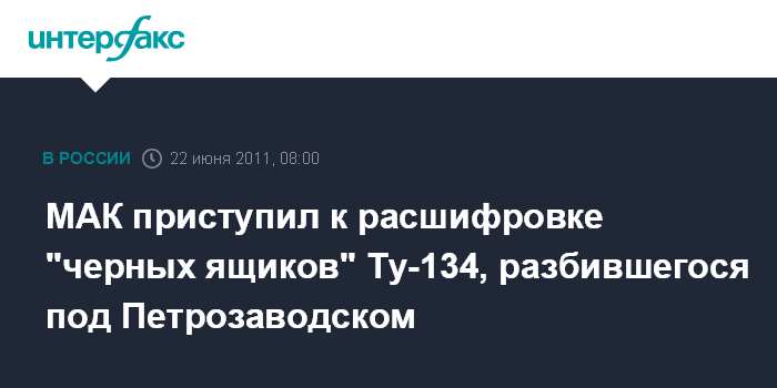Москва. 22 июня. ИНТЕРФАКС - Специалисты Межгосударственного авиационного комитета в среду утром приступили к процедуре расшифровки бортовых самописцев авиалайнера Ту-134, который в ночь на вторник потерпел катастрофу под Петрозаводском.