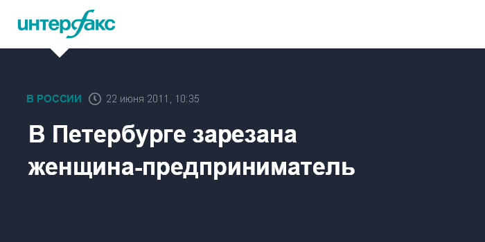 Санкт-Петербург. 22 июня. INTERFAX.RU - В Петербурге двое преступников зарезали женщину, являющуюся учредителем нескольких компаний, сообщил "Интерфаксу" источник в правоохранительных органах в среду.