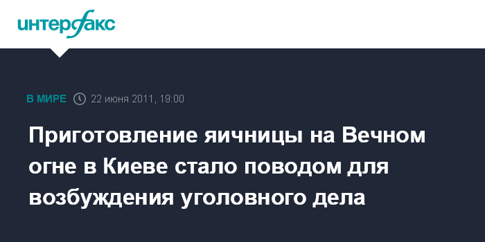 Киев. 22 июня. INTERFAX.RU - Милиция возбудила уголовное дело по факту осквернения Могилы неизвестного солдата в Киеве в связи с размещенным в Интернете видеороликом, демонстрирующем трех неизвестных, жарящих яичницу на Вечном огне у памятника.