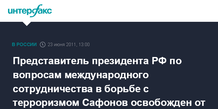 Москва. 23 июня. INTERFAX.RU - Президент РФ Дмитрий Медведев освободил от обязанностей своего представителя по вопросам международного сотрудничества в борьбе с терроризмом и транснациональной оргпреступностью Анатолия Сафонова.