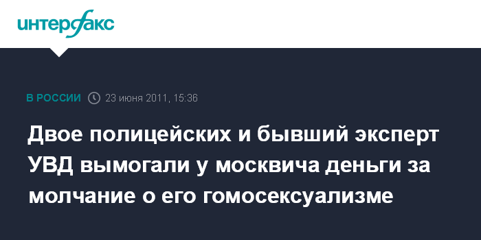 Москва. 23 июня. INTERFAX.RU - Сотрудники управления собственной безопасности ГУМВД России по Москве задержали в среду двух оперуполномоченных УВД по ЦАО и бывшего эксперта УВД по Северо-восточному округу, подозреваемых в вымогательстве денег у жителя столицы за неразглашение сведений о его нетрадиционной сексуальной ориентации, сообщили журналистам в четверг в пресс-службе ГУ МВД РФ по Москве.