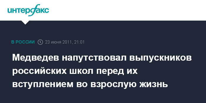 Москва. 23 июня. INTERFAX.RU - Президент РФ Дмитрий Медведев поздравил 650 тысяч выпускников всей России с окончанием школы и вступлением во взрослую жизнь.