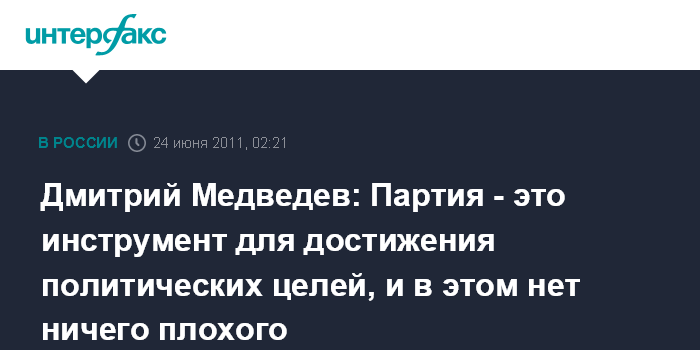 Москва. 24 июня. ИНТЕРФАКС - Президент России Дмитрий Медведев считает, что современные партии являются способом достижения политических целей.
