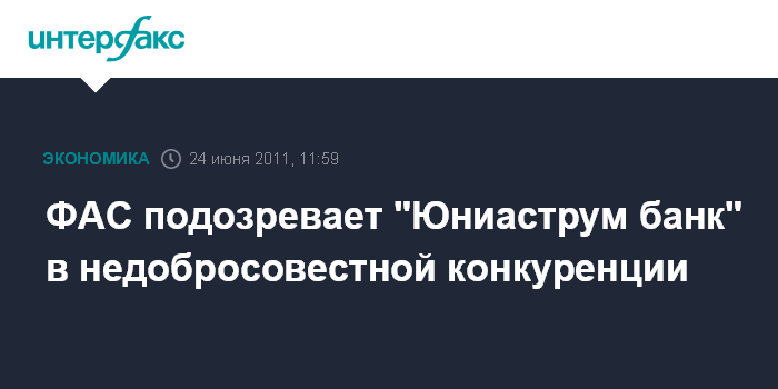 24 июня. INTERFAX.RU - В распространении Юниаструм Банком недостоверной информации об услугах доверительного управления Федеральная антимонопольная служба (ФАС России) усматривает недобросовестную конкуренцию.
