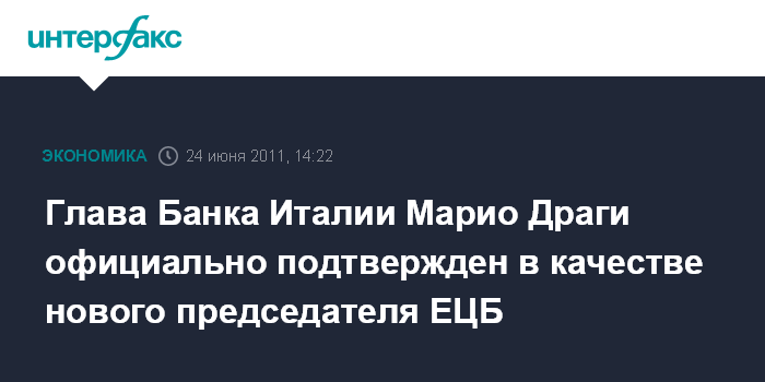 63-летний Драги сменит в этой должности нынешнего главу ЕЦБ Жан-Клода Трише с 1 ноября, заявил пресс-секретарь Евросоюза по итогам саммита в Брюсселе.