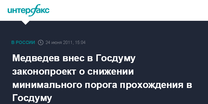 Москва. 24 июня. INTERFAX.RU - Президент России Дмитрий Медведев внес в Государственную Думу проект федерального закона "О внесении изменений в отдельные законодательные акты Российской Федерации в связи со снижением минимального процента голосов избирателей, необходимого для допуска к распределению депутатских мандатов в Государственной Думе Федерального Собрания Российской Федерации", сообщает в пятницу пресс-служба главы государства.