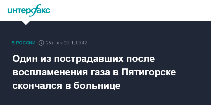 Ставрополь. 25 июня. ИНТЕРФАКС-ЮГ - Один из пострадавших после воспламенения газа на предприятии по транспортировке топлива в Пятигорске скончался, сообщили агентству "Интерфакс-Юг" в отделении реанимации центральной горбольницы Пятигорска.