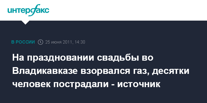 Владикавказ. 25 июня. INTERFAX.RU - По предварительным данным, около 30 человек пострадали при взрыве бытового газа в частном жилом доме во Владикавказе, сообщил "Интерфаксу-Юг" источник в правоохранительных органах. По его словам, на место выехали полиция, пожарные расчеты. Причины происшедшего устанавливаться. Источник уточнил, что взрыв произошел во время празднования свадьбы.