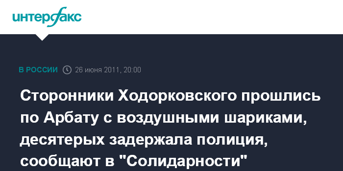 Москва. 26 июня. ИНТЕРФАКС - Десять активистов оппозиционного движения "Солидарность", которые отмечали в воскресенье день рождения экс-главы ЮКОСа Михаила Ходорковского, были задержаны в воскресенье на Старом Арбате.