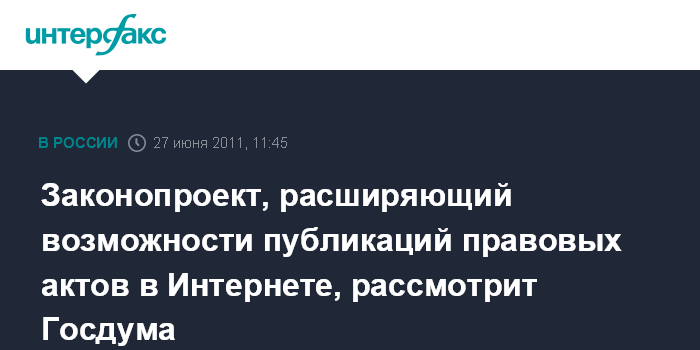Москва. 27 июня. INTERFAX.RU - На этой неделе Госдума рассмотрит в первом чтении президентский законопроект, которым дополняется перечень источников официального опубликования правовых актов Интернет-порталом www.pravo.gov.ru.
