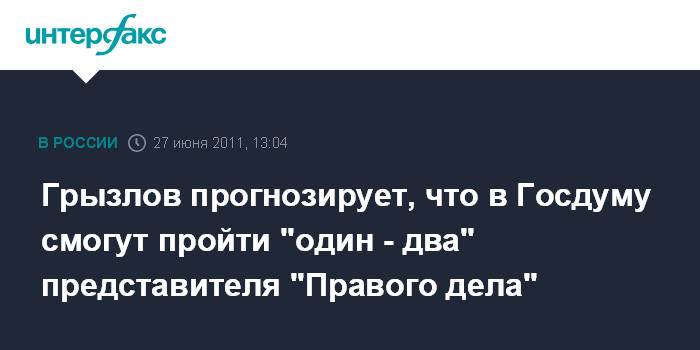 Москва. 27 июня. INTERFAX.RU - "Правое дело" на выборах в Госдуму в декабре может набрать до семи процентов голосов-избирателей и таким образом иметь одного-двух представителей в нижней палате, считает спикер Госдумы Борис Грызлов.