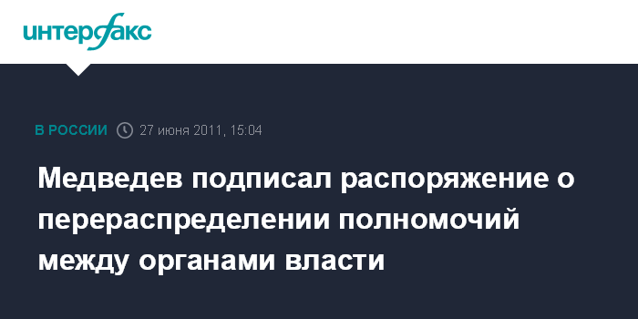 Москва. 27 июня. INTERFAX.RU - Президент России Дмитрий Медведев подписал распоряжение "О подготовке предложений по перераспределению полномочий между федеральными органами исполнительной власти, органами исполнительной власти субъектов Российской Федерации и органами местного самоуправления", - сообщает в понедельник пресс-служба Кремля.