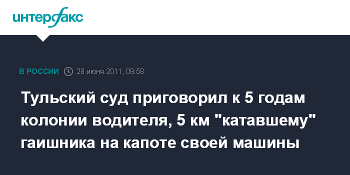 Тульский суд приговорил к 5 годам колонии водителя, 5 км "катавшему" гаишника на капоте своей машины