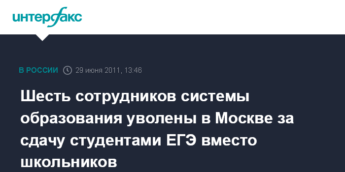 Москва. 29 июня. INTERFAX.RU - В связи со случаем сдачи студентами ЕГЭ за учащихся в 958-й московской школе уволены шесть человек в системе образования, сообщила заммэра столицы по вопросам образования и здравоохранения Ольга Голодец на пресс-конференции в четверг.