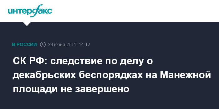 Москва.29 июня. INTERFAX.RU - Следственный комитет РФ не подтвердил сведения о завершении следствия по уголовному делу о беспорядках на Манежной площади 11 декабря 2010 года.