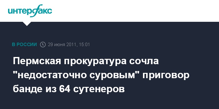 Пермь/Москва. 29 июня. INTERFAX.RU - Гособвинение считает слишком мягким приговор банде сутенеров из 64 человек, вынесенный в Перми в среду, сообщил представитель отдела государственных обвинителей прокуратуры Пермского края Сергей Белкин.