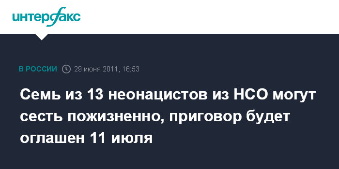Москва. 29 июня. INTERFAX.RU - Московский окружной военный суд (МОВС) назначил на 11 июля вынесение приговора по делу в отношении 13 членов запрещенного Национал-социалистического общества, обвиняемых в многочисленных убийствах и попытках проведения террористических актов.