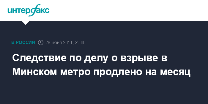 Минск. 29 июня. INTERFAX.RU - Генеральная прокуратура Белоруссии продлила срок предварительного расследования по уголовному делу о взрыве в Минском метро 11 апреля до конца июля, сообщают в среду белорусские интернет-СМИ со ссылкой на генпрокурора республики Григория Василевича.