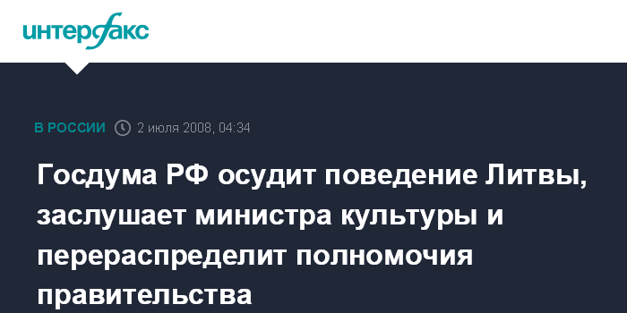 Госдума РФ осудит поведение Литвы, заслушает министра культуры и перераспределит полномочия правительства
