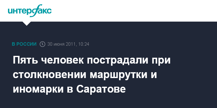 Саратов. 30 июня. INTERFAX.RU - В Саратове в результате ДТП с участием маршрутки получили травмы пять человек, сообщили агентству "Интерфакс-Поволжье" в региональном центре медицины катастроф.