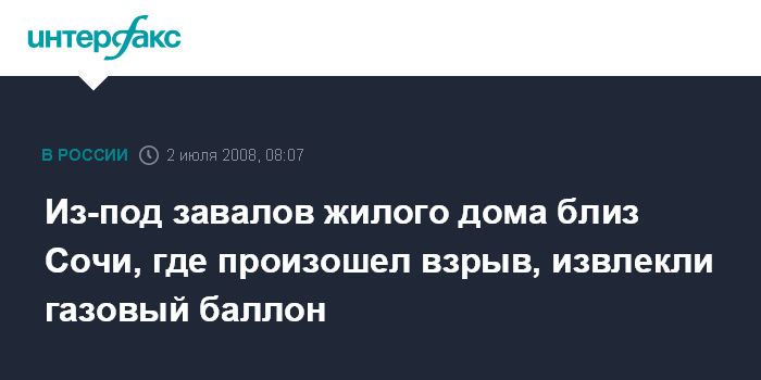 Москва. 2 июля. INTERFAX.RU - Газовый баллон нашли спасатели под завалами жилого дома в пригороде Сочи, где в среду утром произошел взрыв.