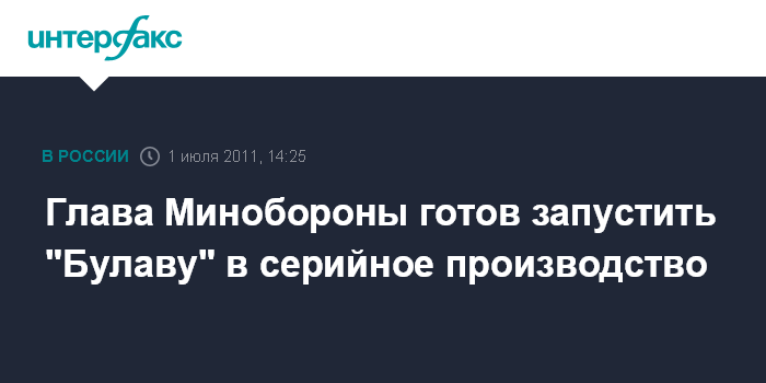 Москва. 1 июля. INTERFAX.RU - Межконтинентальную баллистическую ракету морского базирования "Булава" можно запускать в серию, сообщил министр обороны РФ Анатолий Сердюков.