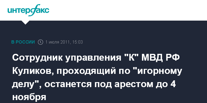 Москва. 1 июля. INTERFAX.RU - Басманный суд Москвы продлил до 4 ноября арест одному из фигурантов "игорного дела" - сотруднику управления "К" МВД РФ Михаилу Куликову, обвиняемому в получении взятки в связи с делом об организации подпольных казино в Подмосковье.