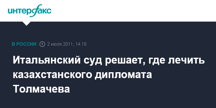 Алматы. 2 июля. INTERFAX.RU - В настоящее время итальянский суд решает вопрос о том, в какой стране лечить казахстанского дипломата Валерия Толмачева, арестованного в Италии за попытку захвата самолета.
