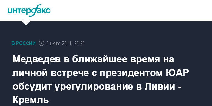 Медведев в ближайшее время на личной встрече с президентом ЮАР обсудит урегулирование в Ливии - Кремль