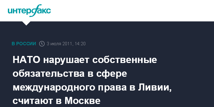 Москва. 3 июля. INTERFAX.RU - НАТО своими действиями в Ливии ставит под сомнение надежность принятых в Лиссабоне обязательств об уважении норм международного права.