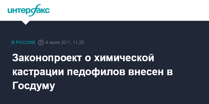 Москва. 4 июля. INTERFAX.RU - В Госдуму внесен законопроект, устанавливающий порядок химической кастрации педофилов.