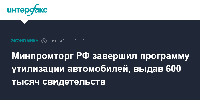 Москва. 4 июля. INTERFAX.RU - Минпромторг РФ завершил программу утилизации автомобилей, выдав по состоянию на 2 июля 600 тыс. свидетельств из доступных в рамках бюджетных ассигнований на 2011 год 601 тыс. свидетельств.