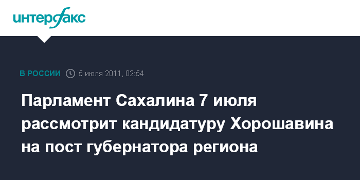 Южно-Сахалинск. 5 июля. ИНТЕРФАКС - ДАЛЬНИЙ ВОСТОК - Депутаты Сахалинской областной Думы в четверг рассмотрят кандидатуру Александра Хорошавина на пост губернатора Сахалинской области, сообщили агентству "Интерфакс - Дальний Восток" в пресс-центре Облдумы.