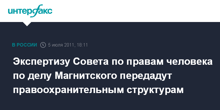Нальчик. 5 июля. INTERFAX.RU - Президент РФ Дмитрий Медведев передаст экспертизу Совета по правам человека, сделанную по "делу Магнитского", правоохранительным структурам, сообщила член совета, директор российского отделения "Трансперенси Интернешнл" Елена Панфилова.