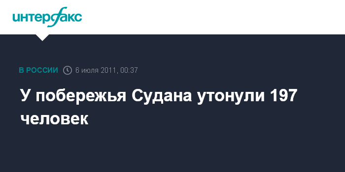 Лондон. 6 июля. ИНТЕРФАКС - В Красном море у берегов Судана затонуло судно с беженцами, погибли 197 человек, сообщает в среду британская телерадиовещательная корпорация Би-Би-Си со ссылкой на государственные СМИ Судана.