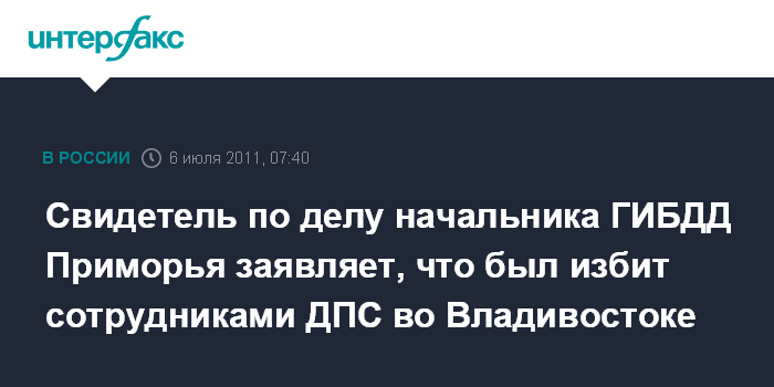 Владивосток. 6 июля. ИНТЕРФАКС-ДАЛЬНИЙ ВОСТОК - История с расследованием уголовного дела об избиении молодого водителя во Владивостоке, в чем подозревают начальника ГИБДД Приморья, получила новое продолжение - свидетель по этому делу заявляет об избиении его сотрудниками ГИБДД.