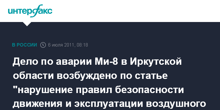 Дело по аварии Ми-8 в Иркутской области возбуждено по статье "нарушение правил безопасности движения и эксплуатации воздушного транспорта" УК РФ