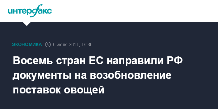 Москва. 6 июля. INTERFAX.RU - Восемь стран Евросоюза ожидают решения российской санитарной службы о возобновлении поставок свежих овощей на рынок РФ, сообщил руководитель Роспотребнадзора, главный государственный санитарный врач РФ Геннадий Онищенко.