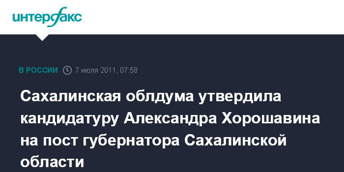 29 июня Д.Медведев внес на рассмотрение Сахалинской областной думы кандидатуру А.Хорошавина для наделения его полномочиями губернатора области.