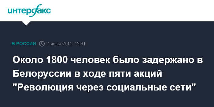 Акции, организованные социальными сетями, прошли в Белоруссии 15, 22, 29 июня, 3 и 6 июля. По данным СМИ и правозащитников, в ходе акции 15 июня было задержано около 100 человек, 20 из них в Минске. 22 июня по республике задержано 450 человек, в столице - 200. 29 июня - около 400, из них 270 в Минске. 3 июля - также около 400, половина - в Минске. В ходе вчерашней акции, по данным правозащитного центра "Весна", было задержано 380 человек, в столице - 190.