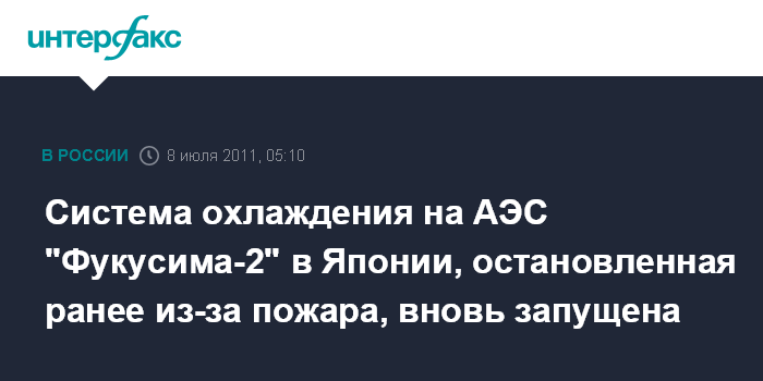 Владивосток. 8 июля. ИНТЕРФАКС-ДАЛЬНИЙ ВОСТОК - Немногим более трех с половиной часов понадобилось специалистам японской АЭС "Фукусима-2", чтобы вновь запустить систему охлаждения первого энергоблока, остановленную в четверг вечером из-за пожара.