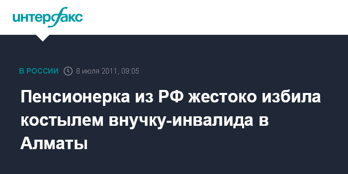 Алматы. 8 июля. INTERFAX.RU - В Алматы задержана 73-летняя гражданка РФ, жестоко избившая 6-летнюю внучку-инвалида II группы, страдающую детским церебральным параличом, сообщил в пятницу агентству "Интерфакс-Казахстан" источник в правоохранительных органах.