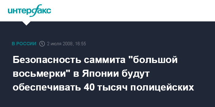 Москва. 2 июля. INTERFAX.RU - Японские власти откомандируют около 40 тыс. полицейских для обеспечения безопасности саммита "большой восьмерки", который пройдет в июле на северном японском острове Хоккайдо, сообщают японские СМИ со ссылкой на данные Национального полицейского управления.