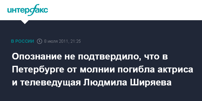 Санкт-Петербург. 8 июля. INTERFAX.RU - Правоохранительные органы после опознания одной из погибших в результате удара молнии в Петербурге установили, что девушка не является телеведущей и актрисой Людмилой Ширяевой, как предполагалось сначала.