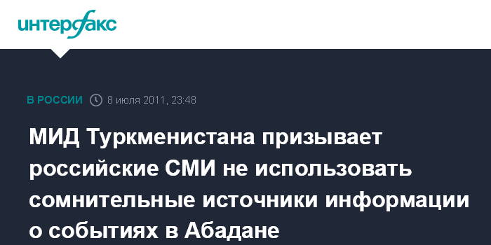 Ашхабад. 8 июля. INTERFAX.RU МИД Туркменистана выразил возмущение освещением в некоторых российских СМИ событий в городе Абадан, где по официальным данным туркменской стороны произошло воспламенение на складах пиротехники.