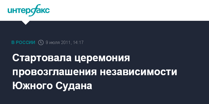 Каир. 9 июля. INTERFAX.RU - Официальная церемония провозглашения независимости Южного Судана стартовала в субботу в городе Джубе, сообщает агентство ЭФЭ. На этом мероприятии присутствуют делегации из 80 стран, а также около 30 глав государств. Ожидается, что в ходе церемонии выступят генсек ООН Пан Ги Мун, президент Южного Судана Сальва Кир, а также президент Судана Омар аль-Башир.
