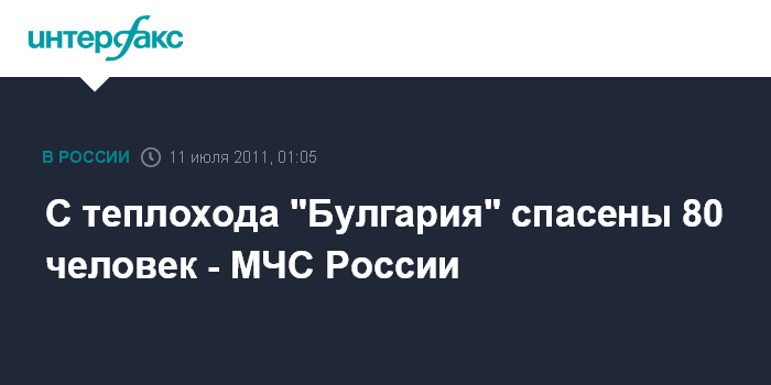 Москва. 11 июля. ИНТЕРФАКС - После крушения теплохода "Булгария" на Волге спасено 80 человек, сообщили Интерфаксу в управлении информации МЧС России.
