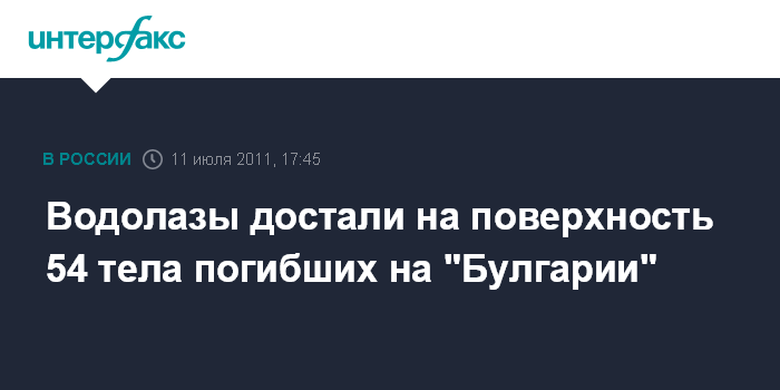 Куйбышевский затон. 11 июля. INTERFAX.RU - По данным на 17:40 мск, число погибших при крушении теплохода "Булгария" составило 54 человека, сообщил агентству "Интерфакс-Поволжье" начальник отдела информации ГУ Центра обеспечения деятельности Федеральной противопожарной службы Татарстана Марат Рахматуллин.